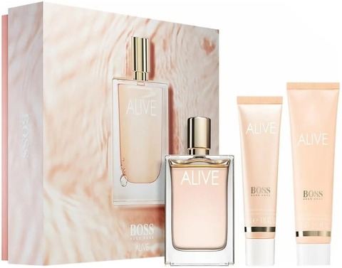 Launch year: 2020. Fragrance Family: Amber Floral. Top notes: Plum, Apple, Blackcurrant, Cinnamon. Heart notes: Sambac jasmine, Madagascan vanilla, Thyme. Base notes: Cedarwood, Sandalwood, Olivewood, Goldenwood. Design house: Hugo Boss. Design house category: fashion. Scent name: Boss Alive. Gender: Ladies. Category: Fragrance. SubType: Gift Set. Barcode: 3614228858069. Set Edp 80Ml + Bl 75Ml + Sg 50Ml. Hugo Boss Ladies Boss Alive Gift Set Fragrances 3614228858069. <br/><br/> This item is only valid for shipment in the Contiguous United States & Canada.