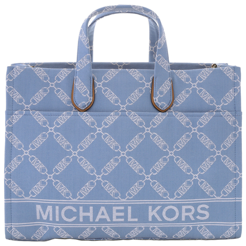 Michael Kors Ladies Tote. SKU: 30R4G3GT3U465. Color: Blue. Size: 15.5W x 11.75H x 5.25D. Michael Kors Monogram-Jacquard Denim Tote Bag. This tote features an allover logo chain jacquard pattern with Empire logo jacquard detailing. It has a rectangular shape and a handle drop of 4.5 inches. The exterior includes a front slip pocket, while the interior boasts a back zip pocket and two front slip pockets. Silver-tone hardware complements the design. 53.2% Cotton/46.8% Polyester.
