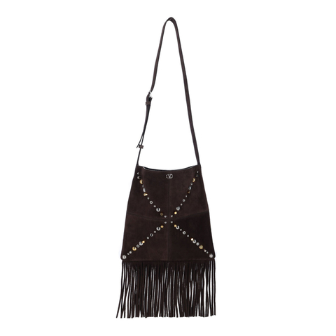 Valentino Garavani Ladies Shoulder Bag. SKU: 8W2B0R31ADG0TO. Color: Brown. Size: A 30 X L 29 cm. Valentino Garavani Nellcote Shoulder Bag. Valentino Garavani Nellcote shoulder bag in brown suede with adjustable shoulder strap, gold and silver metal studs on the front and back, VLogo signature logo on the front, fringes on the bottom, and a main inner compartment. Composition: 100% Calf Leather
