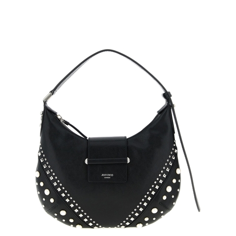 Jimmy Choo Ladies Shoulder Bag. SKU: BARHOBOSQXBBLACKIVORYANTIQUESILVER. Color: White. Size: W 28 x H 18 x D 3 cm. Jimmy Choo Bar Hobo Shoulder Bag. Small 'Bar Hobo' shoulder bag in biker leather, adjustable handle, buckle closure, metal stud and pearl application detail. Composition: 90% lamb leather 10% brass