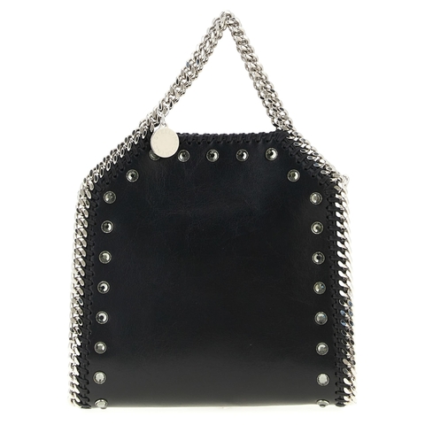Stella Mccartney Ladies Tote. SKU: 391698WP06541000. Color: Black. Size: W 18 x H 17. 5 x D 6 cm - Strap : 50 cm. Stella Mccartney Tiny Falabella Handbag. Tiny Falabella handbag in Alter Mat Crackle fabric with crystal applique on the front and back, diamond-effect chain, double fixed handles, magnetic closure, chain shoulder strap, medallion charm with engraved logo. SUSTAINABLE: Products that do not use leather in accordance with cruelty-free ethics. Composition: 100% polyester