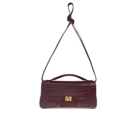 Balenciaga Ladies Tote. SKU: 8349432AB0X6036. Color: Dark Burgundy. Balenciaga Handbag Bel Air. Immerse yourself in refined sophistication with the Bel Air Handbag by Balenciaga. Showcasing a sleek, rectangular silhouette softened by rounded edges, this piece harmoniously blends timeless structure with modern poise. The bag is meticulously crafted from polished calfskin leather, embossed in a striking crocodile pattern a rich, three-dimensional texture that elevates its exclusive allure. Distinguishing details include a front flap closure adorned with a gold-toned, rectangular turn-lock, featuring the designer's signature engraving. The reinforced short handle provides a sophisticated hand-carry option, while the adjustable shoulder strap offers versatile movement. The meticulous symmetry and bold, tactile motif underscore Balenciaga's heritage of unparalleled craftsmanship. Why choose this product? Exquisitely embossed calfskin evokes true luxury Iconic design from Balenciaga's legacy Distinct gold-tone hardware with designer signature Structured yet compact for effortless elegance Versatile carrying options for any occasion. Composition: 100% Calf Leather