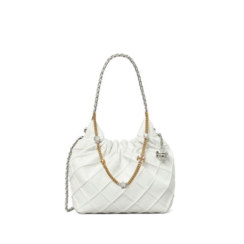 Tory Burch Ladies Hobo. SKU: 164022.100. Color: Blanc. Tory Burch Fleming Distressed Mini Hobo Bag. white magnetic fastening leather and chain-link shoulder strap logo charm This piece comes complete with a protective dust bag. Composition: Body:, 100% Lamb Leather; Lining:, 100% Polyester