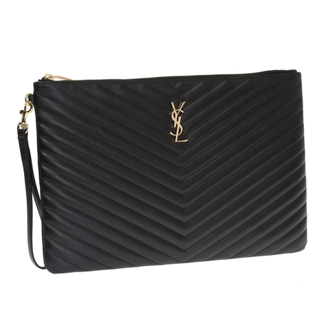 Saint Laurent Ladies Pouch. SKU: 440222 CWU01 1000. Barcode: 2002017856432. Color: Black. Size: 36 cm x 24.5 cm x 2.5 cm. Saint Laurent Ladies Black Monogram Quilted Document Holder. Saint Laurent Monogram Document holder is matelasse leather featuring a top zip fastening, a removable wrist strap, interlaced with YSL metal initials, a gold-tone metal hardware, a grosgrain lining, 1 main interior compartmetn, 2 flat pockets, and 6 credit card slots. Made in Italy.