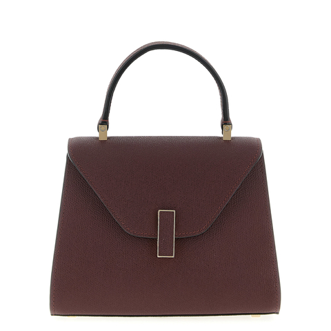 Valextra Ladies Top Handle Bag. SKU: WBES0036028LOC99 RA. Color: Ra Amaranto. Size: W:22cm H:16cm D:12cm. Valextra Iside Top Handle Mini Bag. 'Iside' mini handbag in Millepunte calf leather, hand-lacquered Costa Valextra piping, fixed handle, flap closure with metal spin, rigid base with metal feet, adjustable and removable shoulder strap. Composition: 100% calfskin leather (Bos Taurus)