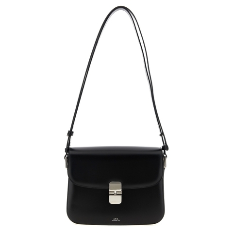 A.P.C. Ladies Shoulder Bag. SKU: PXBVNF61412LZZ. Color: Black. A.P.C. Grace Shoulder Bag. Grace' smooth leather shoulder bag with front embossed logo, magnetic flap closure with metal detail, adjustable shoulder strap, cotton lining. Composition: 100% cow leather (Bos Taurus).
