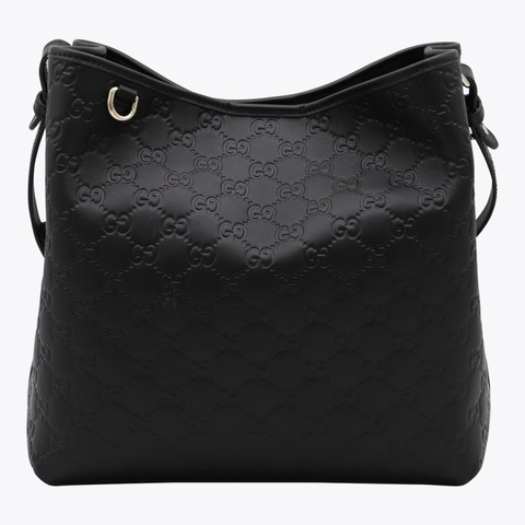 Gucci Ladies Satchel. SKU: 815103AAFDV_1000. Color: Black. Size: L: 9.84 x H: 9.84 x W: 6.30. Gucci Black Leather Satchels. This bag is crafted with the signature GG Jacquard motif and features a magnetic fastening. It has a leather top handle, two internal compartments separated by a central zippered pocket, and a fabric lining. The adjustable leather shoulder strap ensures versatility, while the silver-tone metal hardware adds a sleek finishing touch. Material: 100% Calf Leather. Made in Italy.