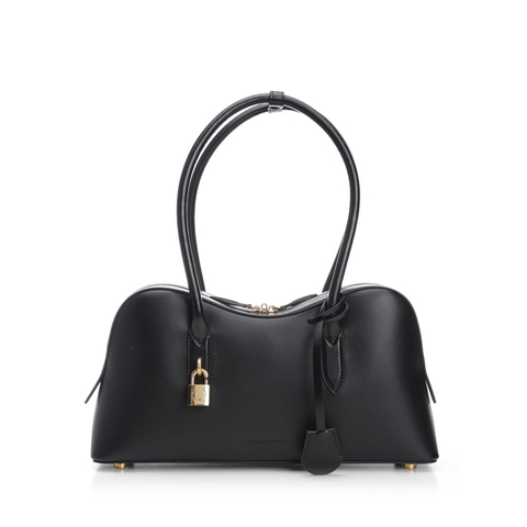 Stella McCartney Ladies Shoulder Bag. SKU: 7B0138 WP0533 1000. Color: Black. Stella McCartney stella Ryder Shoulder Bag. Stella Mccartney 'Stella Ryder' shoulder bag handmade with recycled and grape-derived materials. It features a main compartment and an internal slip pocket, zip closure, brass padlock with engraved logo and double top handle. Composition: F: 70% TRUE HEMP, 30% LYOCELL, T1: 100% POLYAMID, T2: 100% POLYAMID