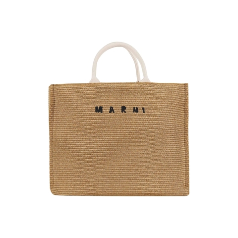 Marni Ladies Shopping Bag. SKU: SHMP0078U0 P3860 097 Z0R42. Color: Sabbia. Marni Shopping Bag. Large Tote Bag. Marni. Sand color. Made of raffia effect fabric. Single compartment with inside pocket. Double cotton top handle. Cotton shoulder strap. Contrast embroidered front logo. Dimensions: Height 34cm, Length 45cm, Depth 20cm