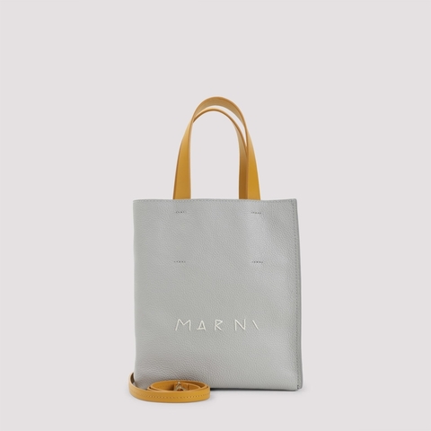 Marni Ladies Mini Bag. SKU: SHMP0040L3.P6533 ZP100. Color: Blue China Everest Spherical Green. Size: W:19cm H:23cm D:10cm. Marni Museo Soft Mini Handbag. Marni Museo Soft Grey and Blue China Grained Calf Leather Mini Handbag. Grey and Blue China soft-grained calf leather, Senape double handles on the top, front white logo, inner zip pocket, lined, attachable and adjustable shoulder strap.