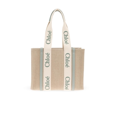 Chloe Ladies Shopping Bag. SKU: C23AS383L1738T. Size: Height: 28cmWidth at widest point: 36cmBottom widt. Chloe Woody Medium Shopper Bag. Elevate your everyday style with the Woody Medium Shopper Bag by Chloe. This impeccably crafted rectangular tote resonates with understated luxury, blending refined beige canvas with exquisite, pastel calfskin leather accents and vertical stitched details. Two wide, elongated ecru handles each meticulously adorned with the distinctive green Chloe logo make the bag effortlessly versatile, ensuring comfort whether carried by hand or over the shoulder. The generously proportioned shape, complete with a wide base, elegantly accommodates all essentials while maintaining a silhouette that is both timeless and modern. Subtle green leather highlights, interior linen-cotton lining, and premium metal hardware distinguish this piece as uniquely sophisticated. Inspired by Chloe's heritage of progressive Parisian design, this shopper embodies a harmonious blend of sensuality, functionality, and bold identity. Why choose this product? Signature blend of natural linen and supple calfskin Iconic, repeat-branded handles for unmistakable style Spacious interior with a sturdy, structured form Exquisite craftsmanship from a world-renowned fashion house Versatile design perfect for daily elegance and refined occasionsComposition: Inner Layer: 68% Linen 32% Cotton Outer Layer: Linen Calf Leather Other Elements: 100% Metal