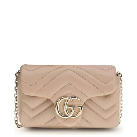 Gucci Ladies Mini Bag. SKU: 841290AAFAX5753. Color: Rose. Size: W 6.5 x H 3.7 x D 1.7. Gucci GG Marmont Leather Mini Shoulder Bag. This mini bag features a stunning chain-link shoulder strap, a chic foldover top with a secure magnetic closure, and a striking GG plaque on the front, all accented by luxurious gold-tone metalware for a refined, elegant finish. 100% Lambskin. Made in Italy.