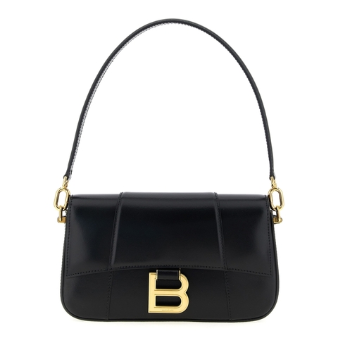 Balenciaga Ladies Shoulder Bag. SKU: 8289762ABQ81000. Color: Black. Balenciaga hourglass Small Shoulder Bag. Small 'Hourglass' shoulder bag in shiny calf leather box, magnetic flap closure with antiqued metal logo detail, removable handle, adjustable and removable shoulder strap, back pocket. Composition: 100% calfskin leather (Bos Taurus)