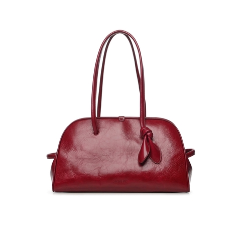 Jacquemus Ladies Bowling Bag. SKU: 25HBAU00417AC20C01490. Color: Purple. Jacquemus le Turismo Leather Bowling Bag. Made of shiny leather - Double-slider zip closure - Embossed lettering logo - Tubular leather handles - Made in Italy - Dimensions: 39 x 21 x 17 cm - Color: Burgundy