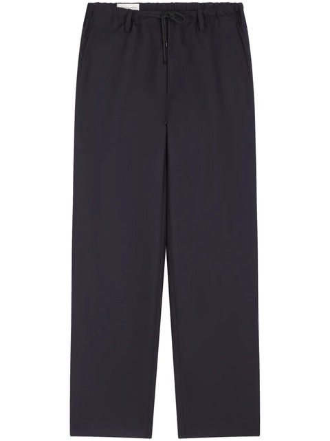 navy blue wool belt loops elasticated drawstring waistband two side slit pockets straight leg