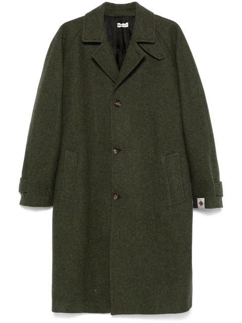 green virgin wool felted front button fastening notched lapels long raglan sleeves buttoned cuffs two side welt pockets central rear vent straight hem diamond-quilted lining mid-length