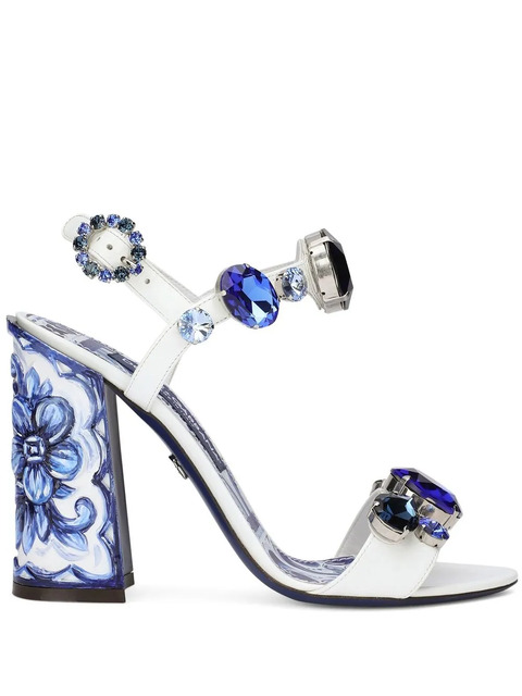 blue/white leather Majolica print crystal embellishment high block heel open toe buckle-fastening ankle strap