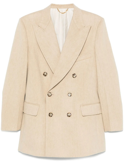 light beige virgin wool-cashmere blend non-brushed fleece mélange effect peak lapels double-breasted button fastening shoulder pads long sleeves buttoned cuffs chest welt pocket dart detailing two front flap pockets English rear vents full lining straight hem