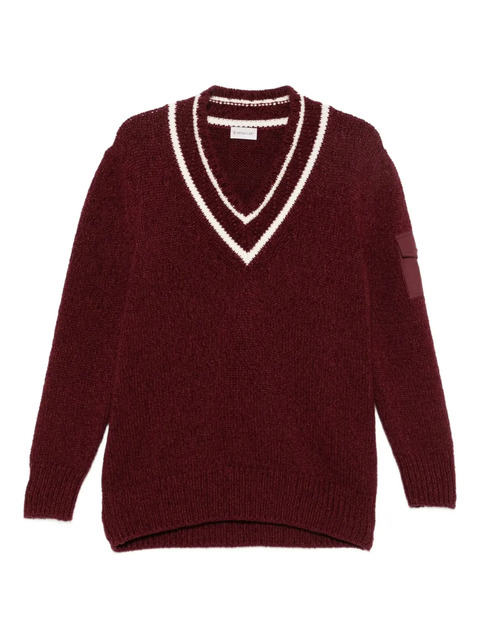 burgundy V-neck long sleeves stripe detailing ribbed trim