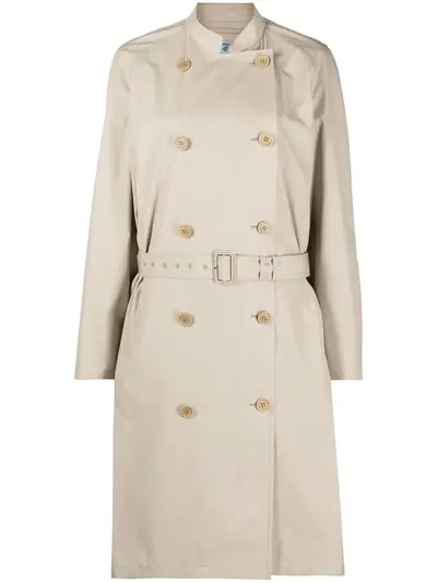 beige cotton blend double-breasted button fastening belted waist triangle logo long sleeves mid-length straight hem