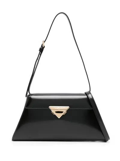 black calf leather patent finish enamel triangle logo adjustable top handle adjustable detachable shoulder strap gold-tone hardware foldover top push-lock fastening internal patch pocket