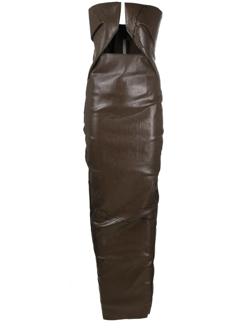 cedar brown cotton blend denim matte finish cracked effect cut-out detailing strapless rear zip fastening rear slit floor-length