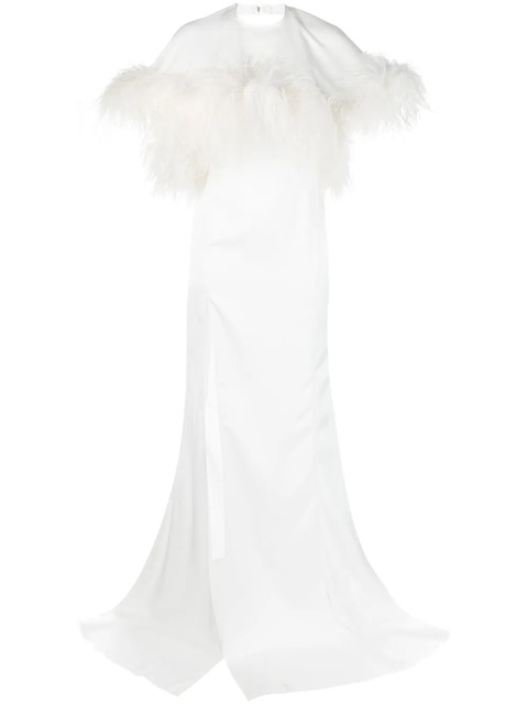 white feather-trim detailing cut-out detailing cape design sleeveless open back side slit floor-length