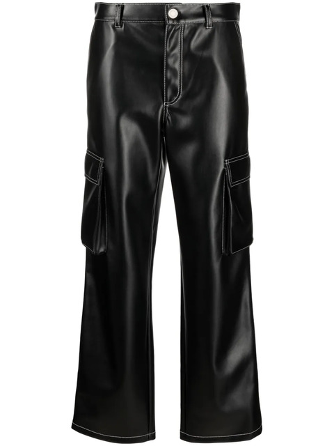 black faux leather low-rise front button and zip fastening belt loops two side cargo pockets two rear flap pockets flared cuffs