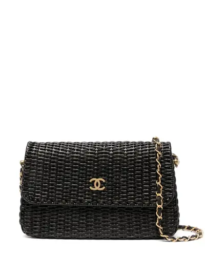 black woven wicker design foldover top with magnetic fastening leather and chain-link shoulder strap signature interlocking CC logo main compartment internal patch pocket contrast lining Serial Number: 6689616 This item comes with an original Chanel authenticity card. Condition: EXCELLENT. This previously owned item is in near-perfect condition with no signs of damage or use.