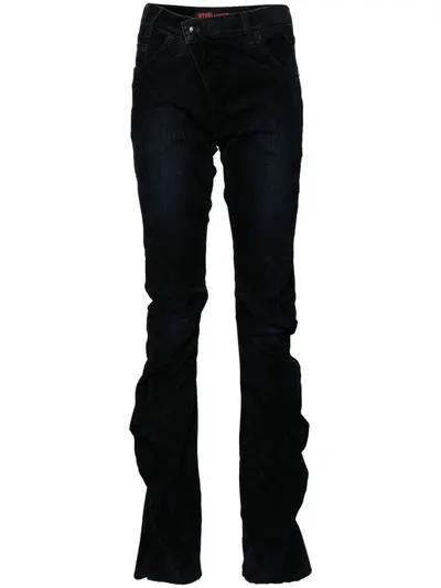 midnight blue stretch-cotton velvet denim draped design mini logo tag logo patch to the rear off-centre front button fastening pleat detailing bootcut classic five pockets