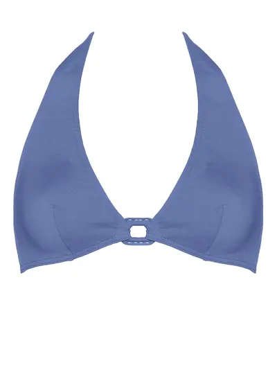 cornflower blue halterneck tie fastening rear clasp fastening triangle cup Be mindful to try on swimwear over your own garments.