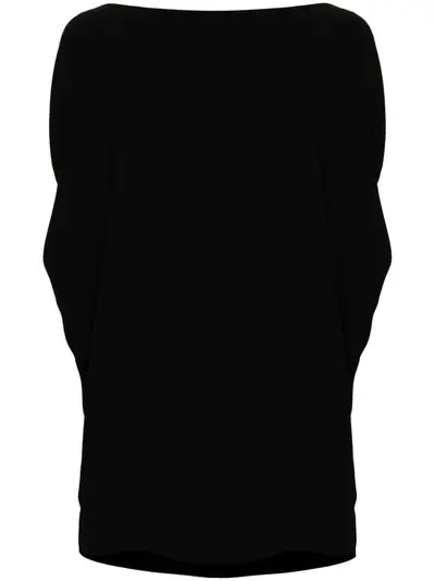 black crepe texture draped design boat neck half-length sleeves elasticated cuffs two side inset pockets straight hem above-knee length