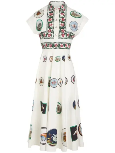 ecru/multicolour cotton all-over graphic print classic collar front button placket short sleeves flared skirt below-knee length