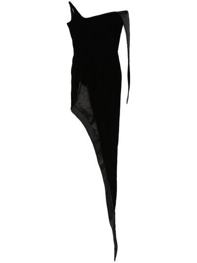 black velvet concealed rear zip fastening single shoulder strap asymmetric neck corset style spike detail fitted waistline full lining asymmetric hem