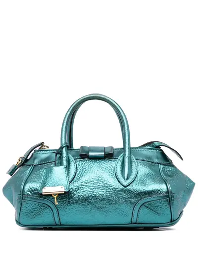 metallic leather body rolled leather handles top zip closure interior zip and slip pockets blue Serial Number: ITCF&10SCA Inclusions: padlock, key, charm. Condition: GOOD. This previously owned and used item is in good condition with minimal signs of use. This may include fading of material or plating and scratches. Declared Damages: Handle/Strap Feature(s) Moderate Cracks. Please refer to the photos on this product page for a detailed view of the item, including any damages declared.