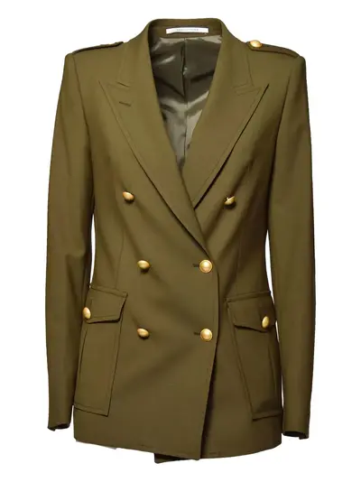 olive green double-breasted button fastening two front flap pockets central rear vent buttoned cuffs