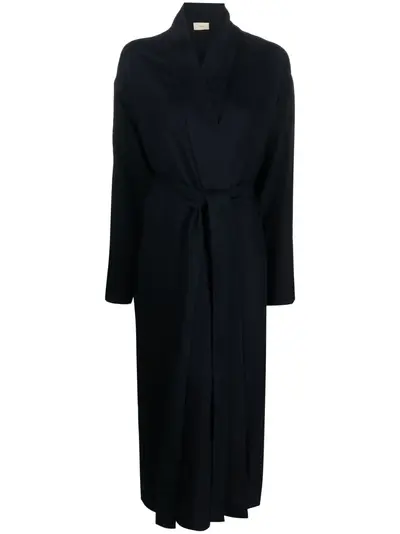 indigo blue cotton shawl lapels drop shoulder long sleeves belted waist two side inset pockets unlined