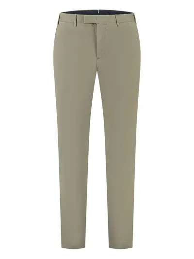 olive green concealed front fastening two side slit pockets belt loops tapered leg