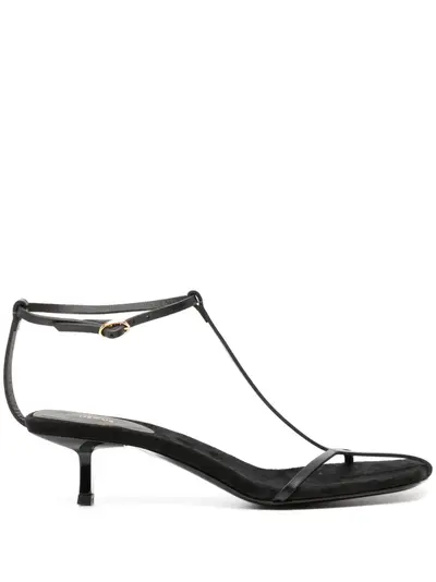 black calf leather T-bar strap open toe buckle-fastening ankle strap branded insole low stacked heel gold-tone hardware