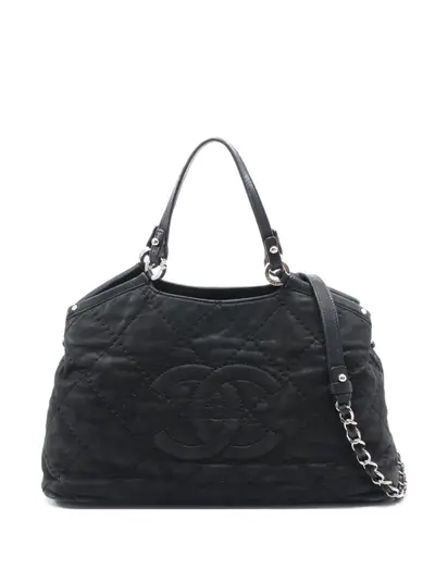 circa 2012-2013 black embossed CC logo detail dual top handles chain-link shoulder strap diamond quilt pattern studded accents Condition: GOOD. This previously owned and used item is in good condition with minimal signs of use. This may include fading of material or plating and scratches.