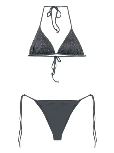 dark grey strass embellishment triangle top rear tie fastening low-rise bottoms tie sides Be mindful to try on swimwear over your own garments.