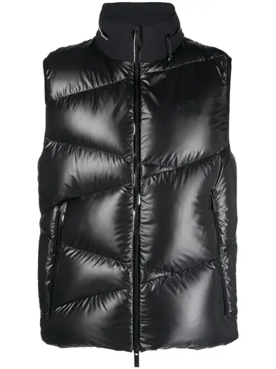black goose down padded design logo patch at the chest high neck concealed hood front two-way zip fastening two zip-fastening pockets sleeveless straight hem
