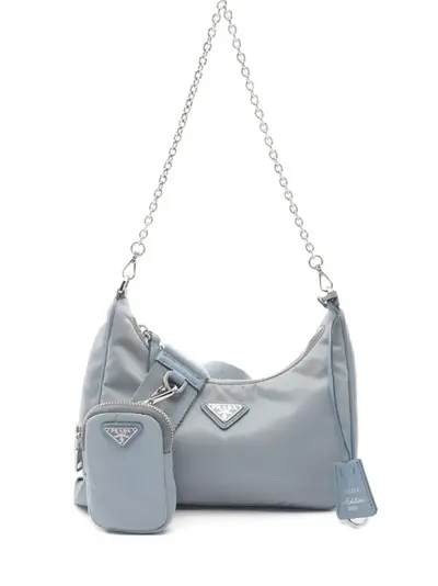 circa 2000s light blue detachable chain strap detachable adjustable shoulder strap top zip fastening triangle logo main compartment removable pouch Condition: GOOD. This previously owned and used item is in good condition with minimal signs of use. This may include fading of material or plating and scratches.