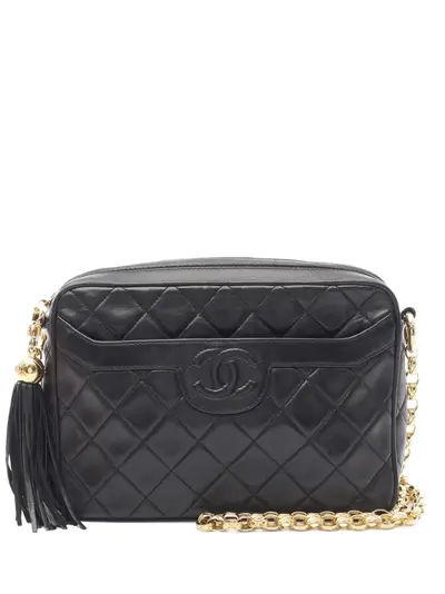circa 1994-1996 black lambskin quilted signature Interlocking CC logo chain-link shoulder strap gold-tone hardware tassel detail Serial Number: 3155813 This item comes with an original authenticity seal. Condition: GOOD. This previously owned and used item is in good condition with minimal signs of use. This may include fading of material or plating and scratches.