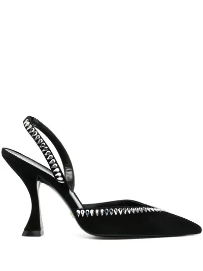 black calf leather calf suede gem embellishment pointed toe elasticated slingback strap high heel