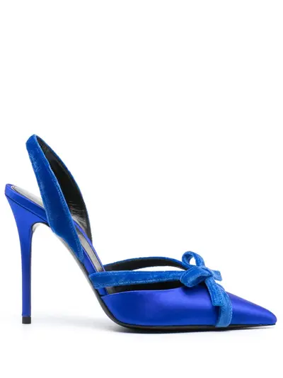 electric blue silk satin crushed velvet bow detailing pointed toe elasticated slingback strap branded leather insole high stiletto heel