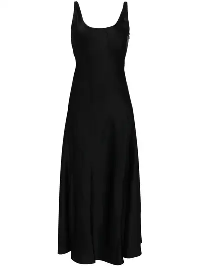 black seam detailing square neck sleeveless low back concealed side hook and zip fastening calf-length