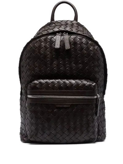 black leather tonal design interwoven design front zip-fastening compartment top zip fastening main compartment single rounded top handle two adjustable shoulder straps