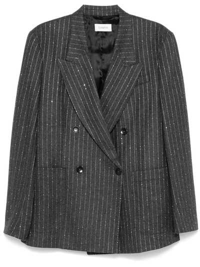 graphite grey wool blend flannel pinstripe pattern double-breasted button fastening sequin embellishment peak lapels shoulder pads with long sleeves buttoned cuffs chest welt pocket dart detailing two side patch pockets multiple internal slip pockets full lining straight hem