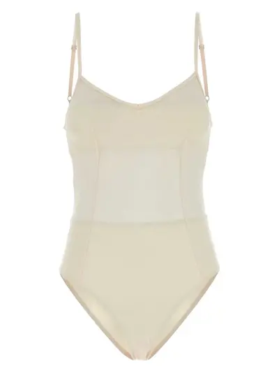 cream white stretch-design tulle panel adjustable shoulder straps V-neck open back Be mindful to try on swimwear over your own garments.
